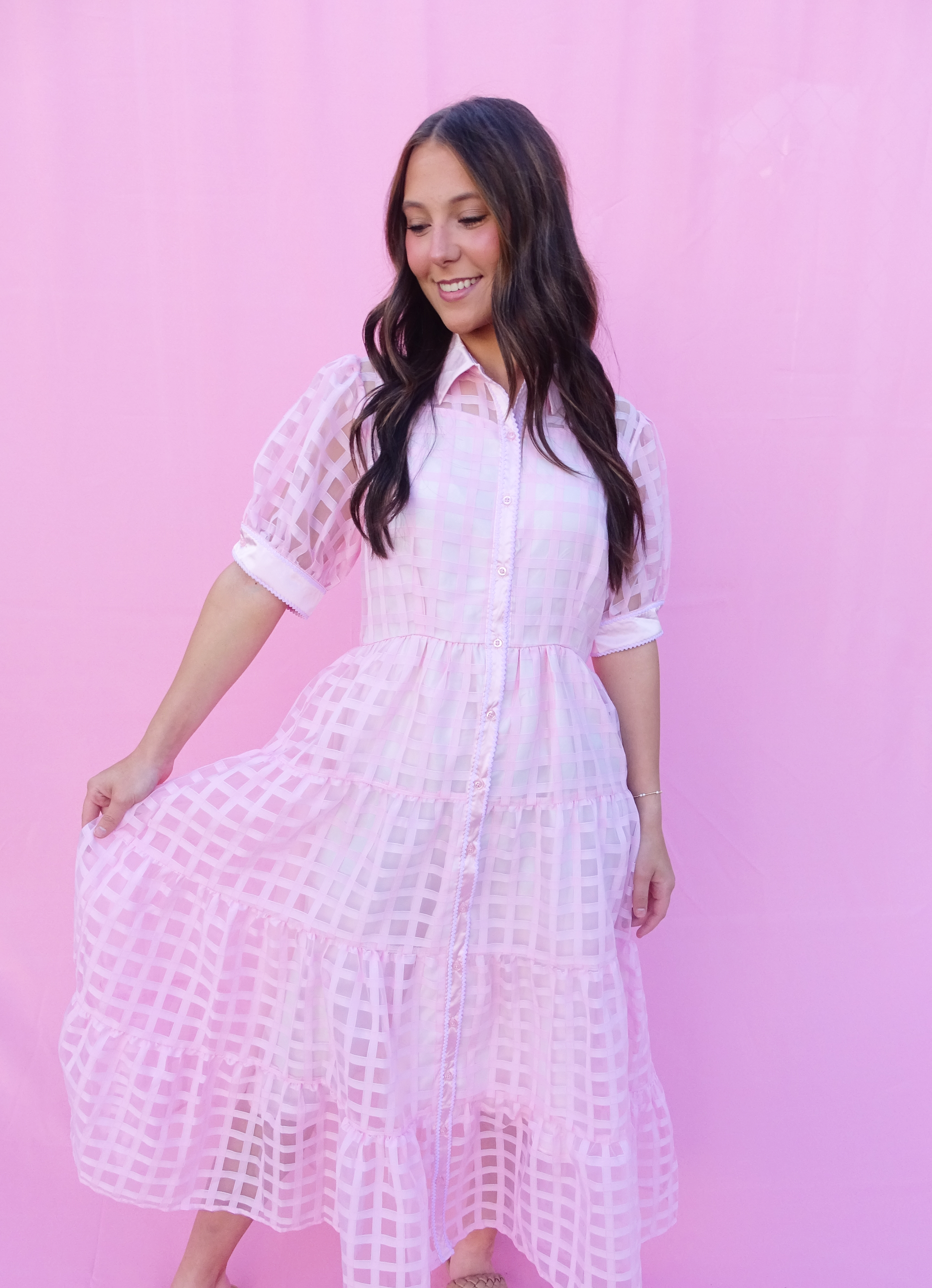 Plaid Organza Ric-Rac Trim Detail Midi Dress. The Model is Wearing a Size Medium.