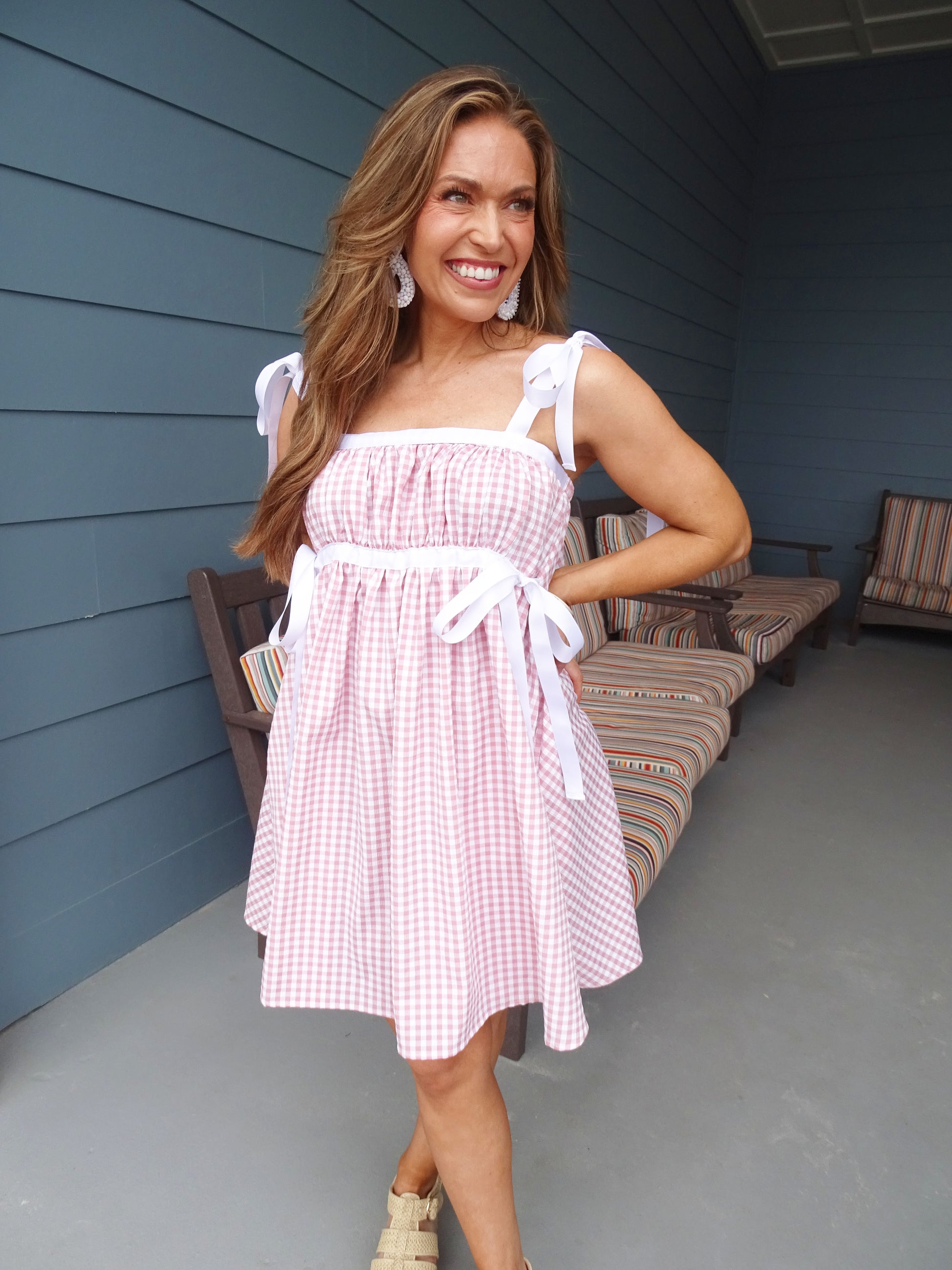 GROSGRAIN BOW STRAP SHOULDER SQUARE NECK EMPIRE WAISTLINE GINGHAM WOVEN BABYDOLL MINI DRESS WITH SIDE POCKET