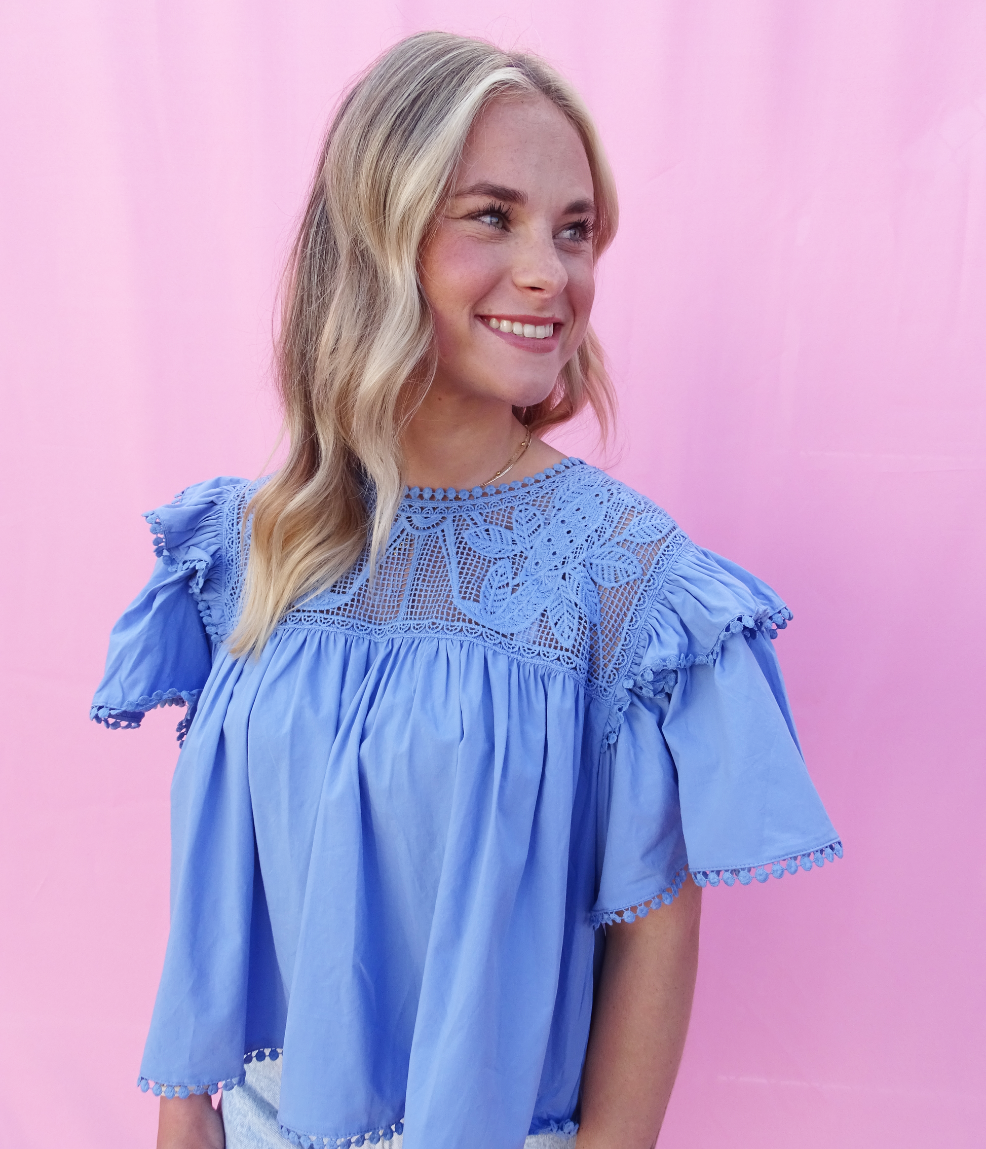 Cropped Round Neck with Flutter Sleeve Top -Round neck Top with flutter sleeve and lace trim details -Button closure at the back -Cropped and super relaxed fit -Great Choice for Office, Work, Dinner, Party, Shopping, Travel, Casual Daily Wear. -A must-have for any fashionable wardrobe, this comfy top is essential. -Perfect match with high heels, sandals, slippers, earrings, necklaces, and hats. In this cool summer, you must get one! -Day to night time, ocean, church and match with your favorite denim, fresh shoes.
