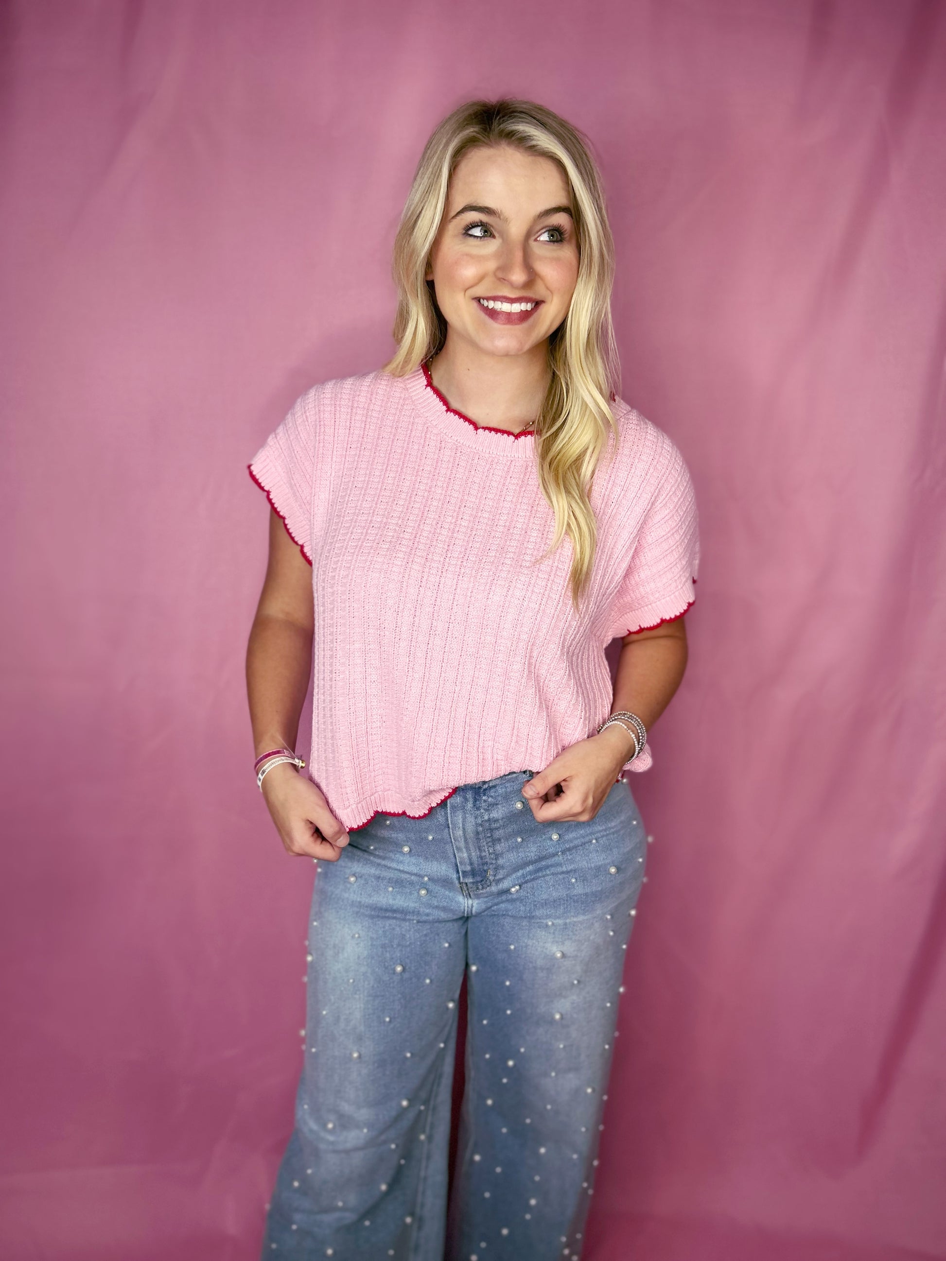 TEXTURED LIGHT WEIGHT SWEATER DOLMAN TOP WITH CONTRAST SCALLOP EDGE
