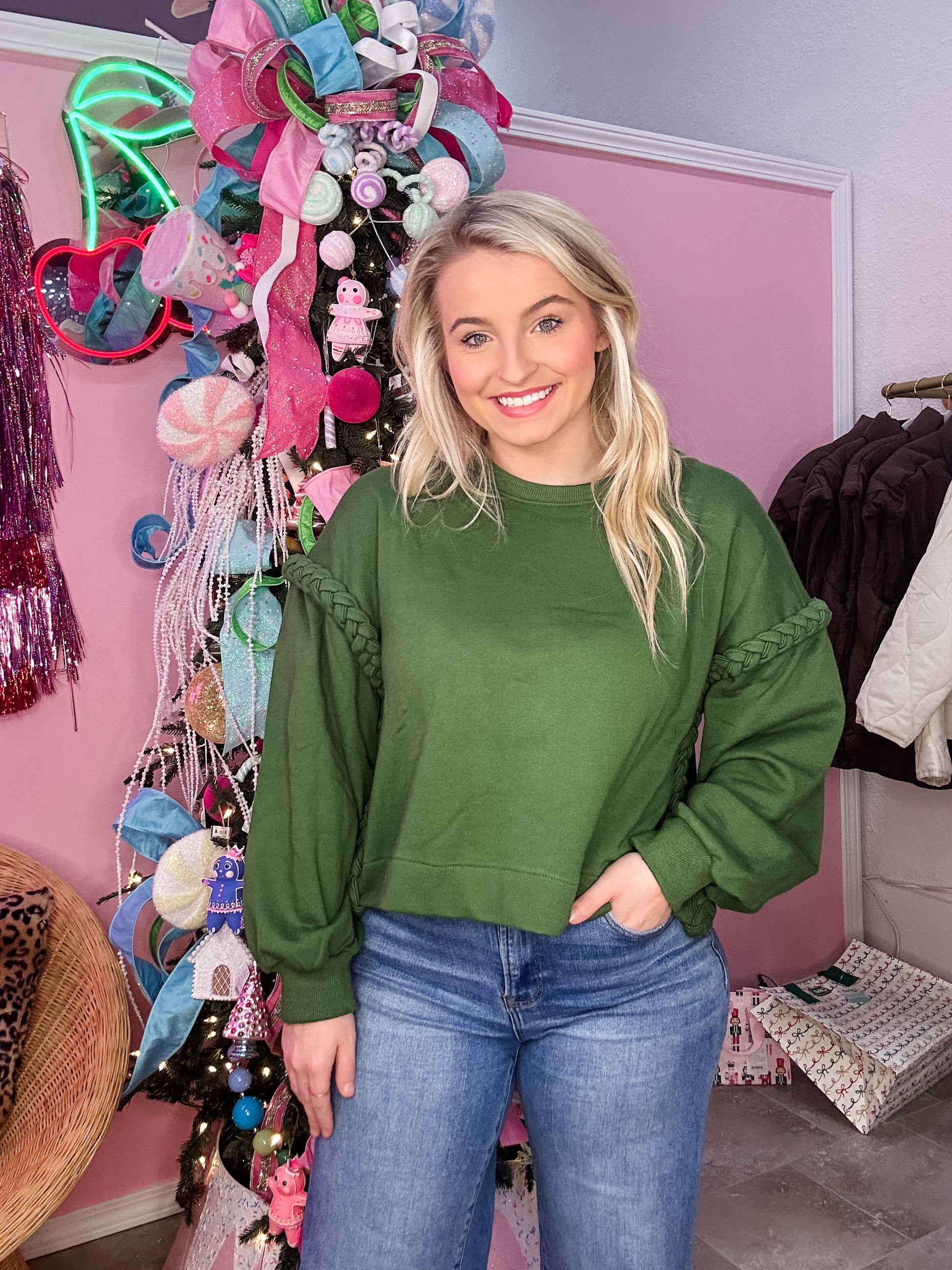 Solid long sleeve cropped top featuring braided detail at shoulder. Unlined. Knit. Non-sheer. Lightweight.